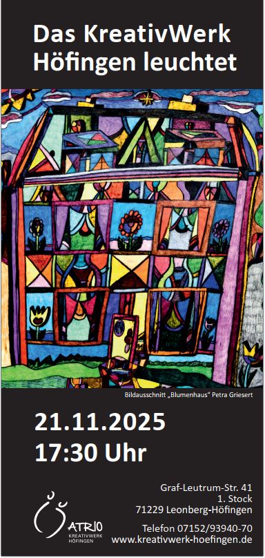 Am Freitag, den 21. November 2025 findet wieder die beliebte Veranstaltung Das KreativWerk Höfingen leuchtet statt. Freuen Sie sich auf eine kurzweilige Versteigerung von Kunstwerken, eine Verlosung (Hauptgewinn ist das Bild Herbstaussicht von Irene Sciuk.), Musik von duofluzz und interessante Gespräche und Begegnungen mit den Künstler*innen!